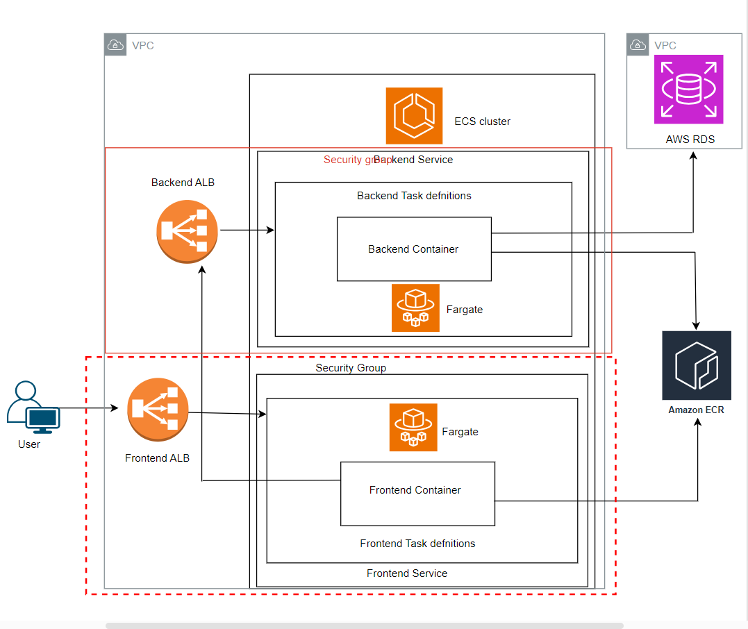 In this application architecture, user access is initiated through browsing the URL of the frontend load balancer, which efficiently directs traffic to frontend containers operating within the Fargate service of the ECS clusters. Fargate, being a self-managed AWS service, ensures automatic scaling and management of the frontend containers based on demand.