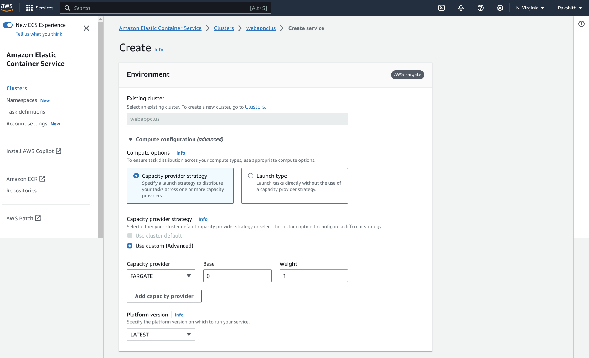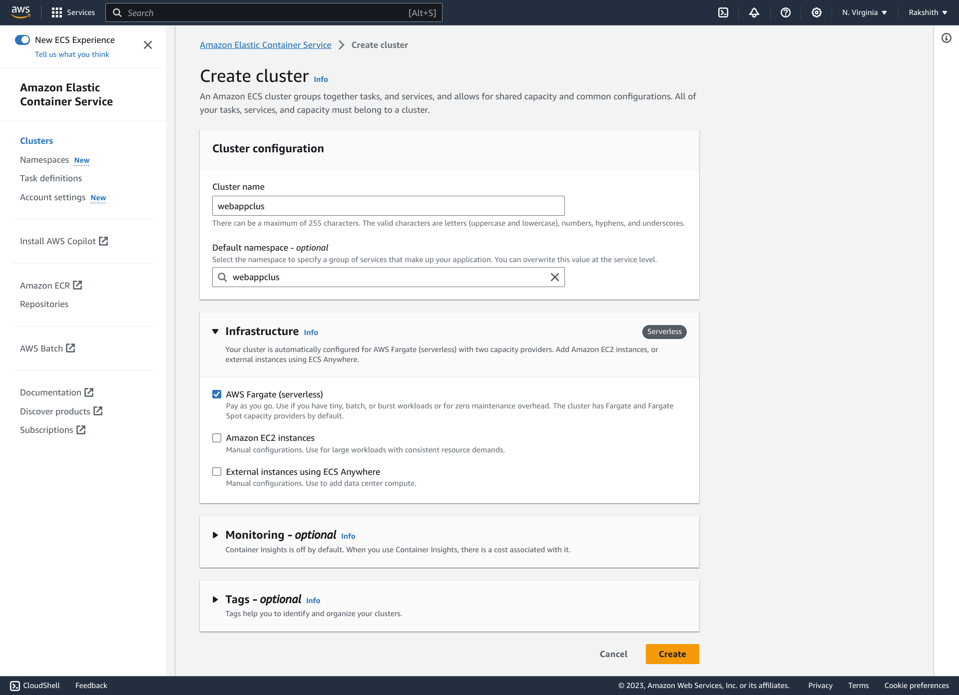 Navigate to Services >> ECS >> Create cluster >> Cluster name — Webappclus >> Infrastructure – AWS Fargate >> Create