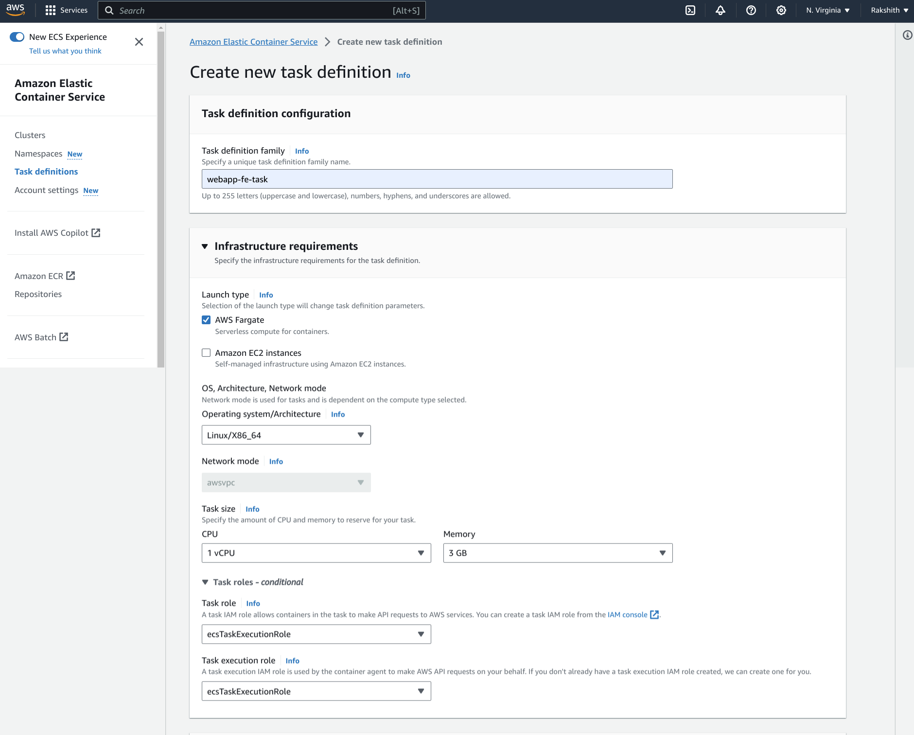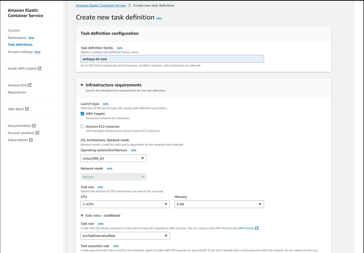 Navigate to >> Services >> ECS >> Task definitions >> Create new task defn