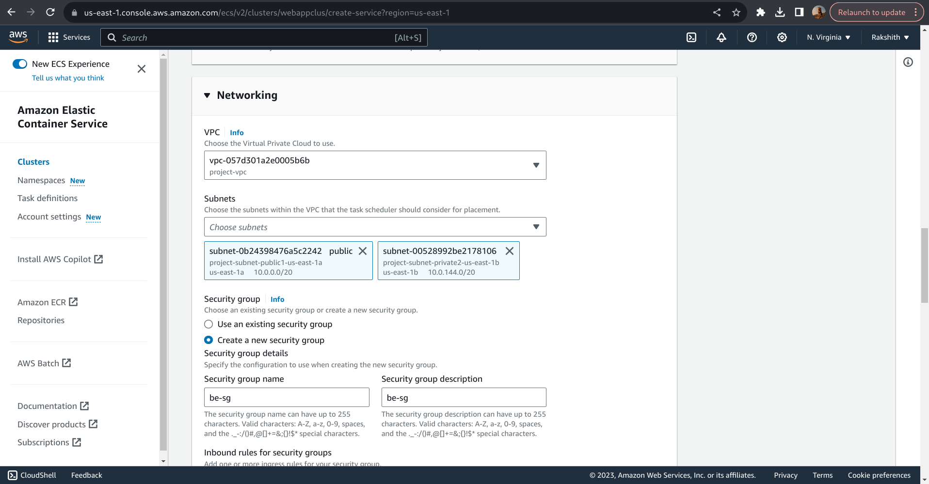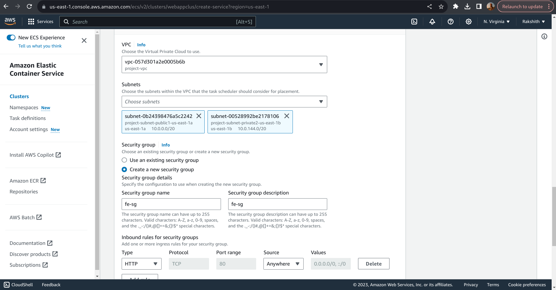 While creating ECS service for the backend we are creating new security group, in this security group we will enable port 5000 and 3306 to be accessed from anywhere (in the inbound rules).