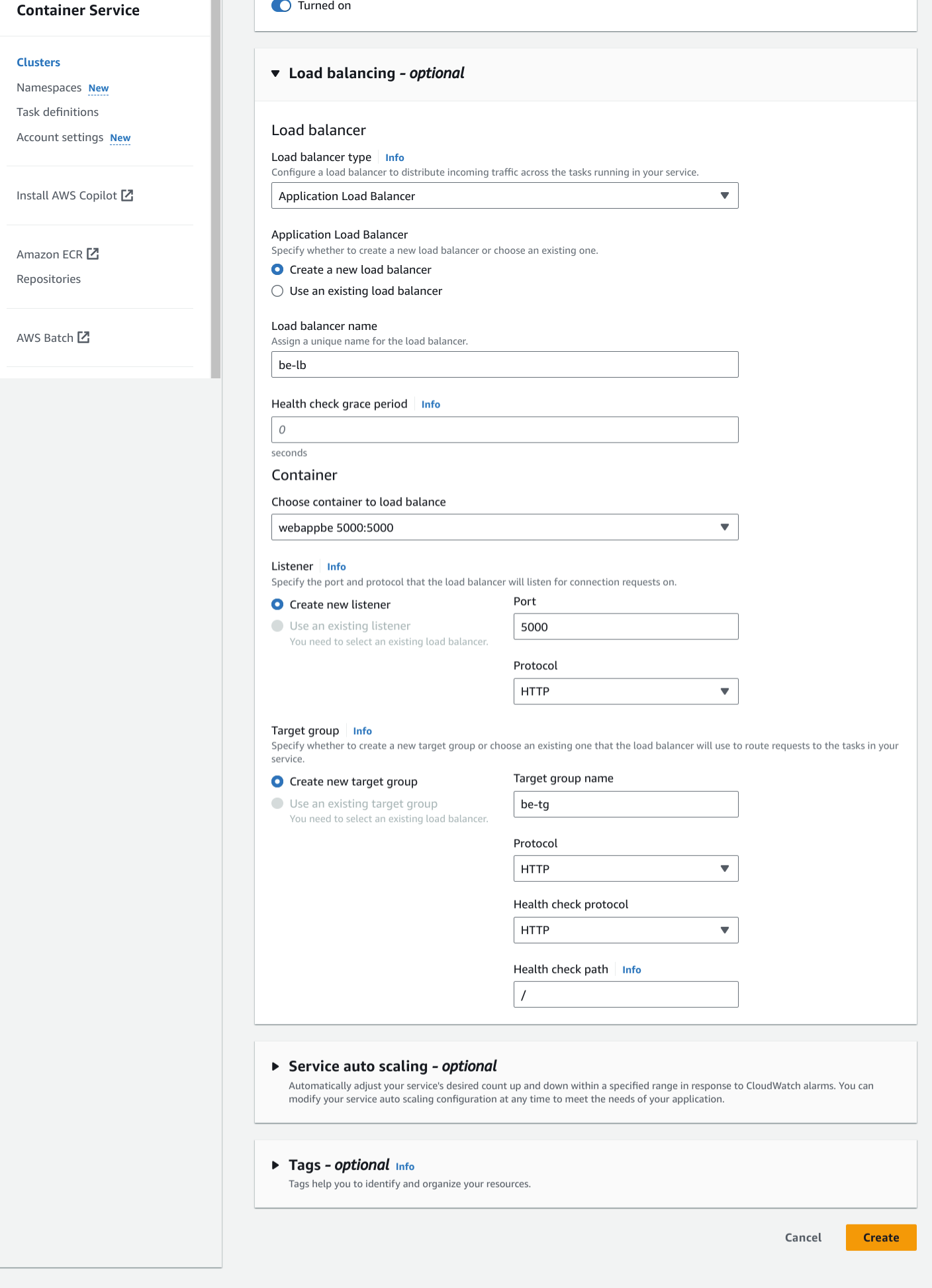 Step 6: Create an ECS service for Backend and grab load-balancer url