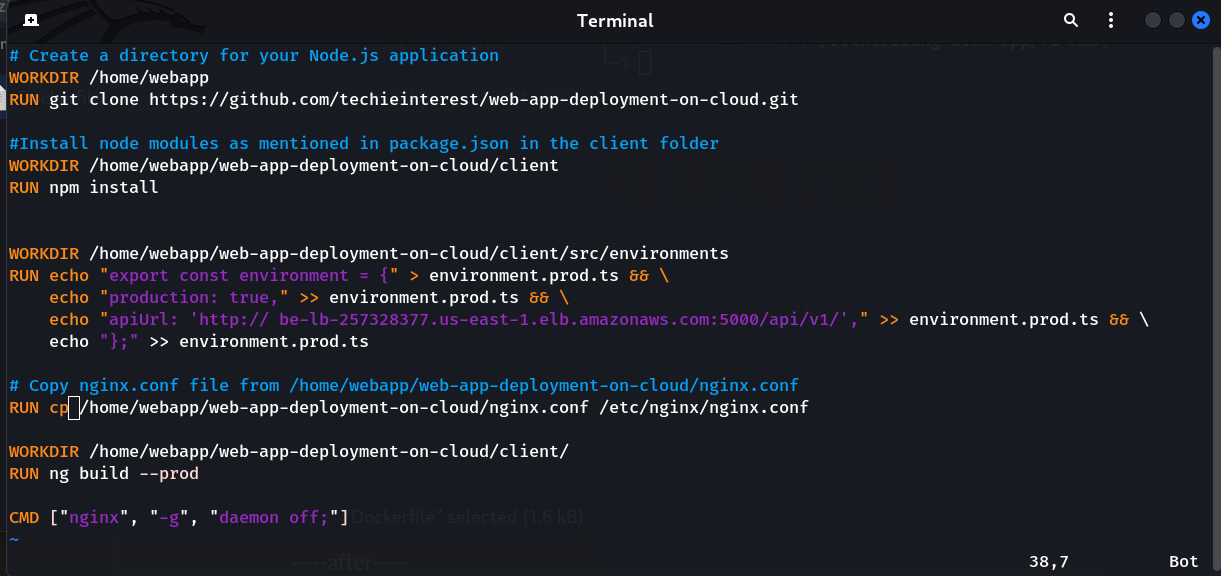 2) Open Dokerfile for Frontend and replace the “localhost” in apiurl with LB URL