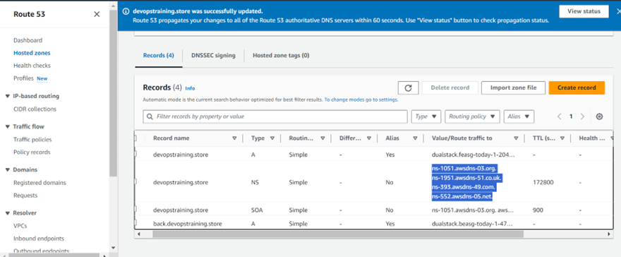 Then update the nameserver of the domain name to the nameserver mentioned in the aws-route53-hosted_zone.