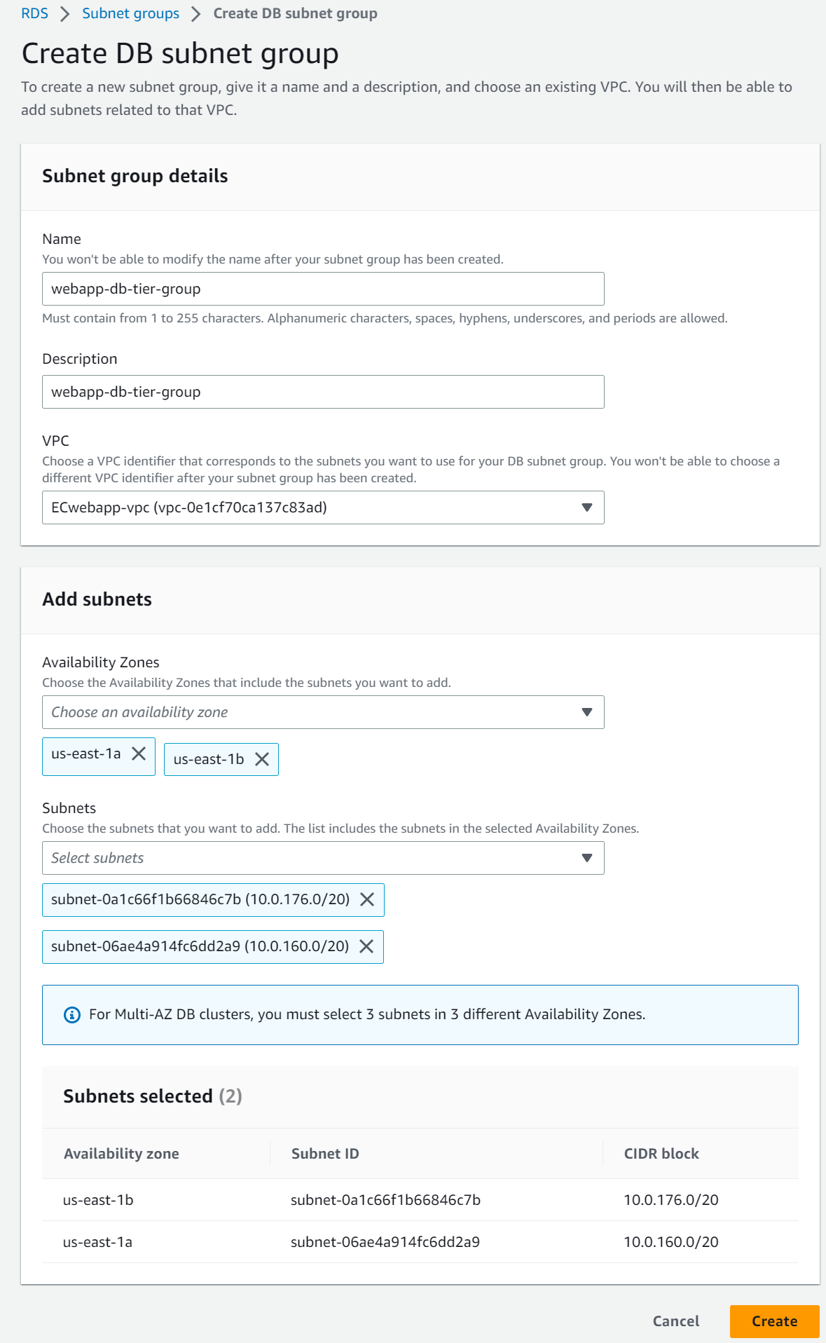 Navigate to RDS, hit Subnet Group on the left, and create DB Subnet group. Give it a name, select VPC, and selct 2 private subnets.
