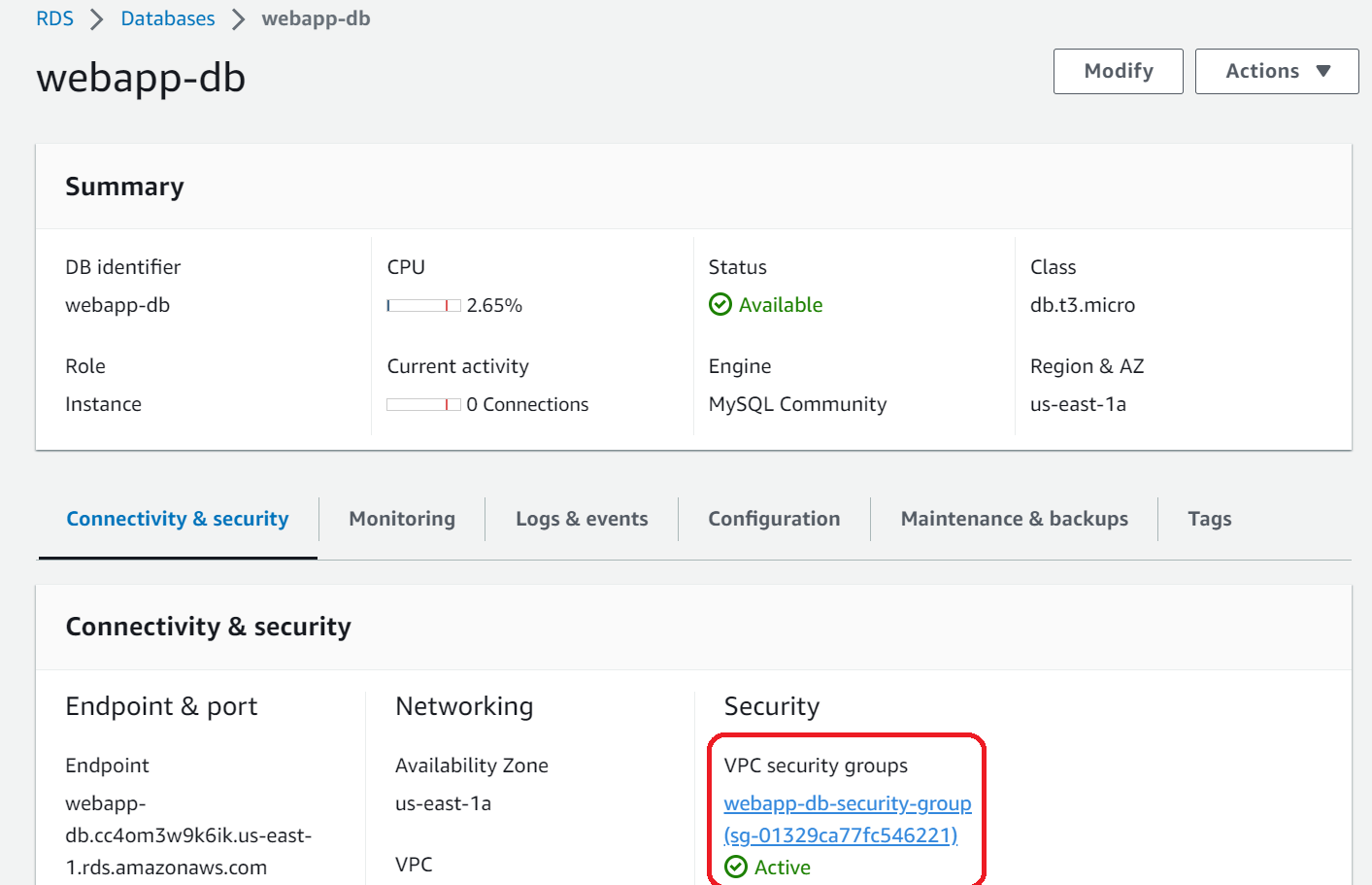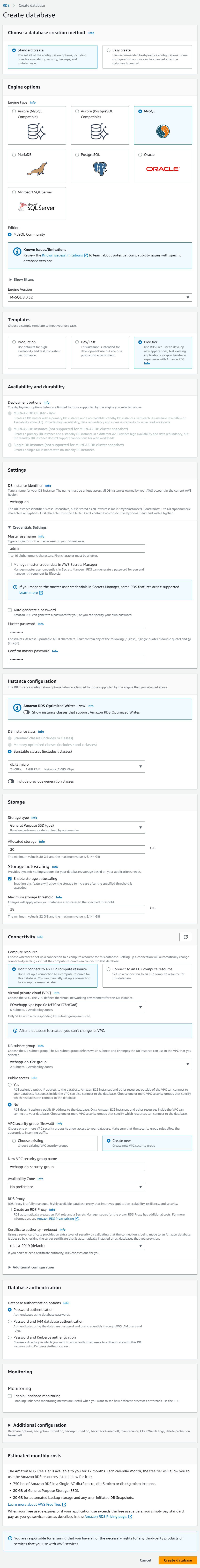 Now we go to the Databases section on the left pane and Create Database. We choose MySQL as our engine. In the Settings section, set up a master password and confirm it. In the Connectivity section, we will choose VPC, and create a new VPC security group.