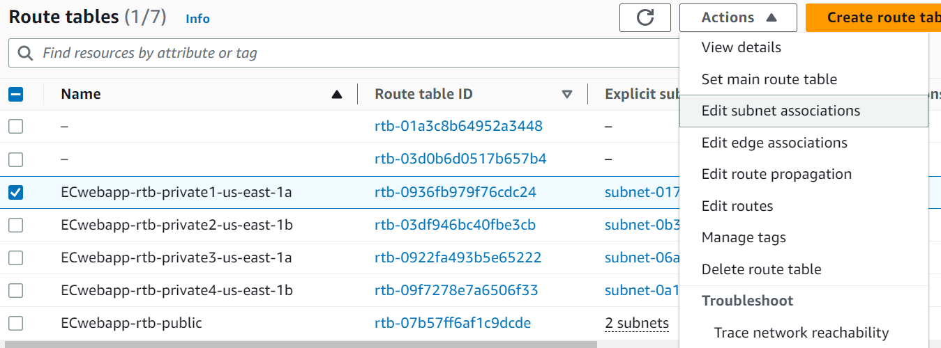 Now we can delete the other private route tables. Check the boxes for the subnets then from the actions drop-down click Delete route table.