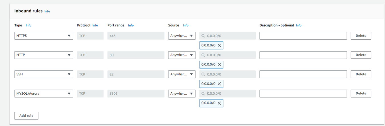It opens the security group, Hit on Actions → Edit Inbound Rules. Delete the old security rule and add a new rule. We will allow port 3306 to be opened from anywhere.