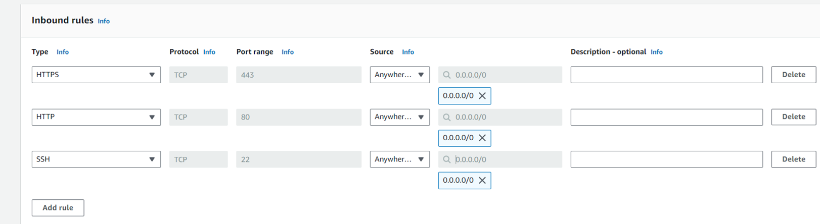 Go to EC2 in the left panel select “Security Groups” and Create a Frontend security group with ports 80, 443, and 22 open from anywhere so that users/customers from any location can visit your web application.
