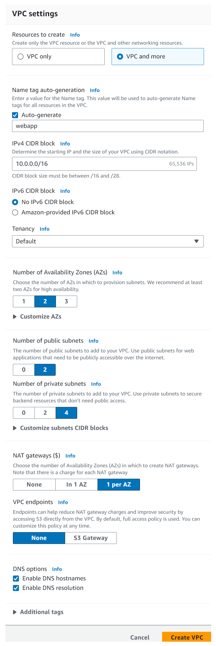 Input your project name and check to the auto-generate box. Select 2 public subnets and 4 private subnets. Your settings should look like this so far.
